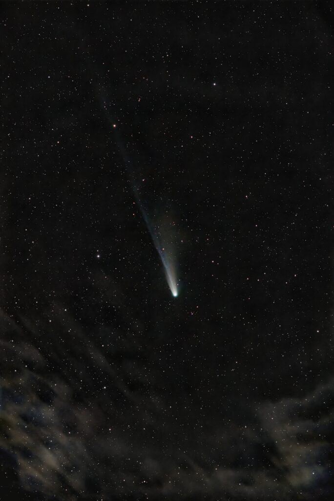 Gleich 3 Kometen waren in diesem Herbst sichtbar. Der hellste von ihnen war der Komet C/2025 A6 Lemmon, der von Ende Oktober bis Anfang November sogar mit einem Fernglas beobachtet werden konnte. Leider spielete aber das Wetter noch mit. In einer Nacht Ende Oktober klarte es kurzzeitig auf. So konnte Hajo Koppert die Gelegenheit nutzen, von meinem Balkon den Kometen mit seiner Canon EOS R6 und 200 mm Objektiv zu fotografieren. Zitat: »Es gestaltet sich schwieriger als gedacht. Ich konnte den Polarstern nicht sehen und daher die Montierung nicht vernünftig einnorden. Da deshalb kein GoTo funktionierte, hatte ich dann eine Viertelstunde gebraucht, um den Kometen zu finden. Im Display der Kamera war der Kometenkopf kaum von Sternen zu unterscheiden. Bis dann die Wolken kamen, sind 15 Bilder a 6 Sekunden entstanden.«