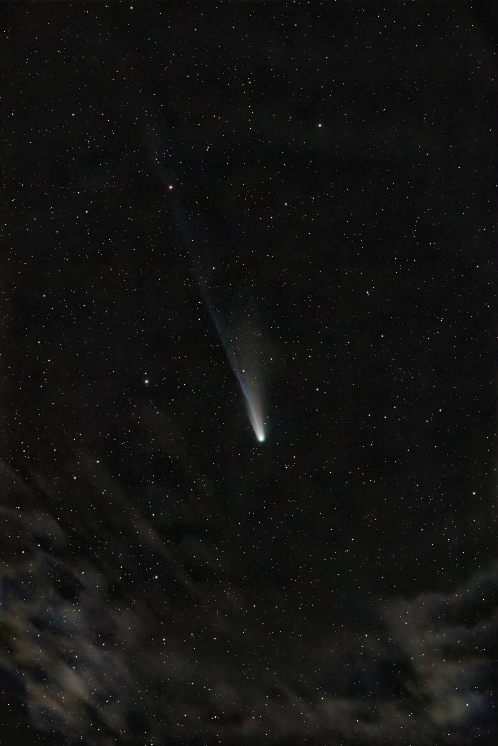 Gleich 3 Kometen waren in diesem Herbst sichtbar. Der hellste von ihnen war der Komet C/2025 A6 Lemmon, der von Ende Oktober bis Anfang November sogar mit einem Fernglas beobachtet werden konnte. Leider spielete aber das Wetter noch mit. In einer Nacht Ende Oktober klarte es kurzzeitig auf. So konnte Hajo Koppert die Gelegenheit nutzen, von meinem Balkon den Kometen mit seiner Canon EOS R6 und 200 mm Objektiv zu fotografieren. Zitat: »Es gestaltet sich schwieriger als gedacht. Ich konnte den Polarstern nicht sehen und daher die Montierung nicht vernünftig einnorden. Da deshalb kein GoTo funktionierte, hatte ich dann eine Viertelstunde gebraucht, um den Kometen zu finden. Im Display der Kamera war der Kometenkopf kaum von Sternen zu unterscheiden. Bis dann die Wolken kamen, sind 15 Bilder a 6 Sekunden entstanden.«
